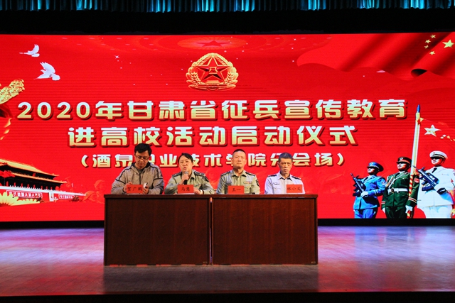 6月10日,2020年甘肃省征兵宣传教育进高校活动(酒泉分会场)启动仪式在我校举行。市委常委、酒泉军分区司令员魏军良,肃州区委常委、人民武装部部长王一,酒泉职业技术学院党委委员、副校长薛仰全等领导以及酒泉职业技术学院500余名师生通过网络直播观看了启动仪式。