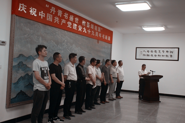 中国美术家协会会员、酒泉市美协副主席王东进先生致辞,预祝本次书画展取得圆满成功;党委书记、校长易志军代表学校向光临开幕式的各位领导及嘉宾表示热烈的欢迎,并宣布酒泉职业技术学院“丹青书盛世、翰墨颂祖国”庆祝中国共产党成立九十九周年书画展开幕。