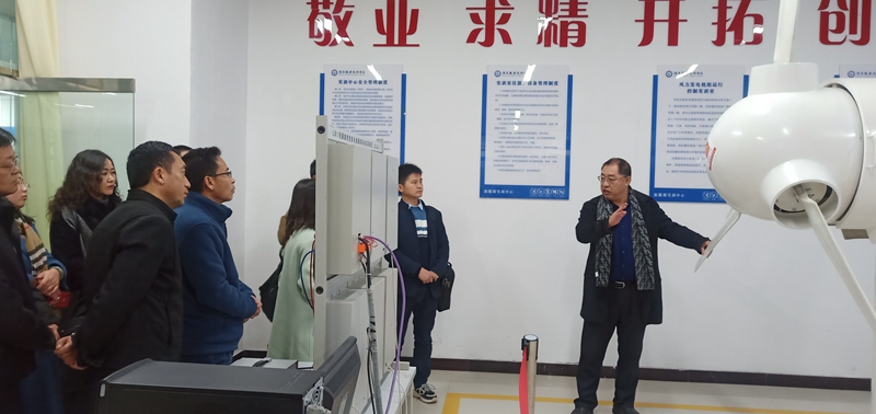 王心辉一行在党委委员、副校长许军的陪同下实地考察了工科实训中心、校史馆以及光伏电厂等教育教学设施,重点了解了我校实验实训条件建设情况、办学成效、办学特色以及校园文化建设等内容。