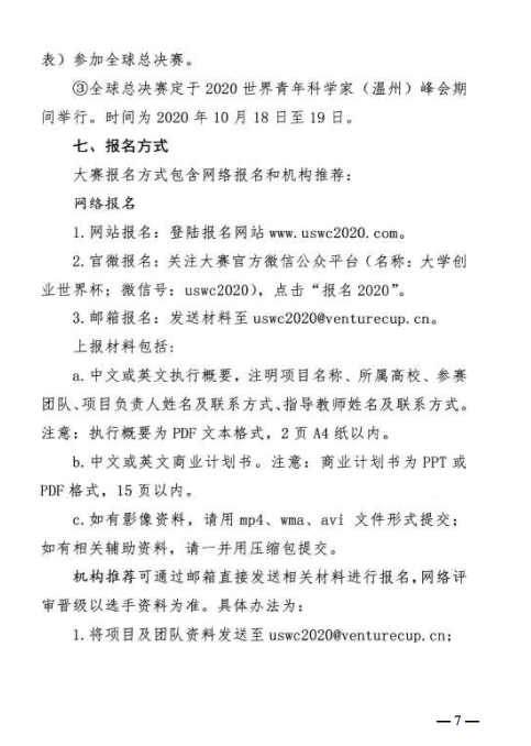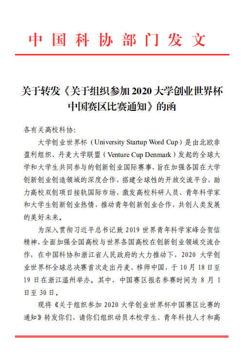 关于转发《关于组织参加 2020 大学创业世界杯 中国赛区比赛通知》的函