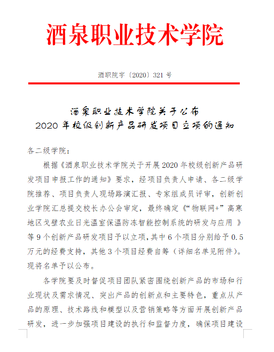 j酒泉职业技术学院关于公布2020年校级创新产品研发项目立项的通知