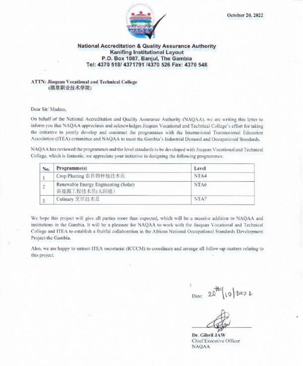 2022年10月25日,世界教育组织联合会公布了“冈比亚国家职业标准开发项目”立项建设名单,新能源工程学院申报的新能源工程技术员(太阳能)NAT6级岗位职业标准开发项目成功入选立项。