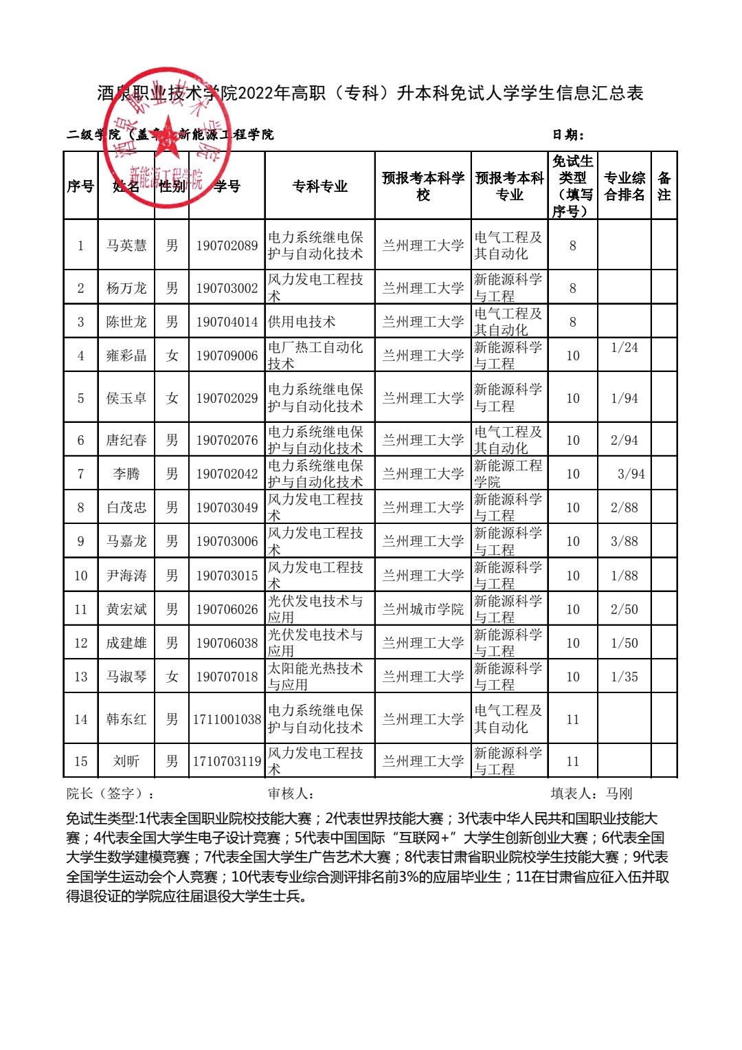 根据甘招委发【2022】1号关于印发《2022年甘肃省普通高校高职(专科)升本科免试生招生工作实施方案》的文件精神,我院严格按照高职(专科)升本科免试入学资格申报条件和要求对上报学生的相关材料进行审核,符合高职(专科)升本科免试入学资格的候选人共15人,其中获得甘肃省职业院校学生技能大赛一等奖学生3人;高职(专科)在读期间专业综合测评排名前3%的应届毕业生10人;在甘肃省应征入伍并取得退役证的学院应往届退役大学生士兵毕业生2人。经2022年1月29日学院行政会议审核通过,拟推选以下15名同学为新能源工程学院2022年高职(专科)升本科免试入学候选人,特此公示!