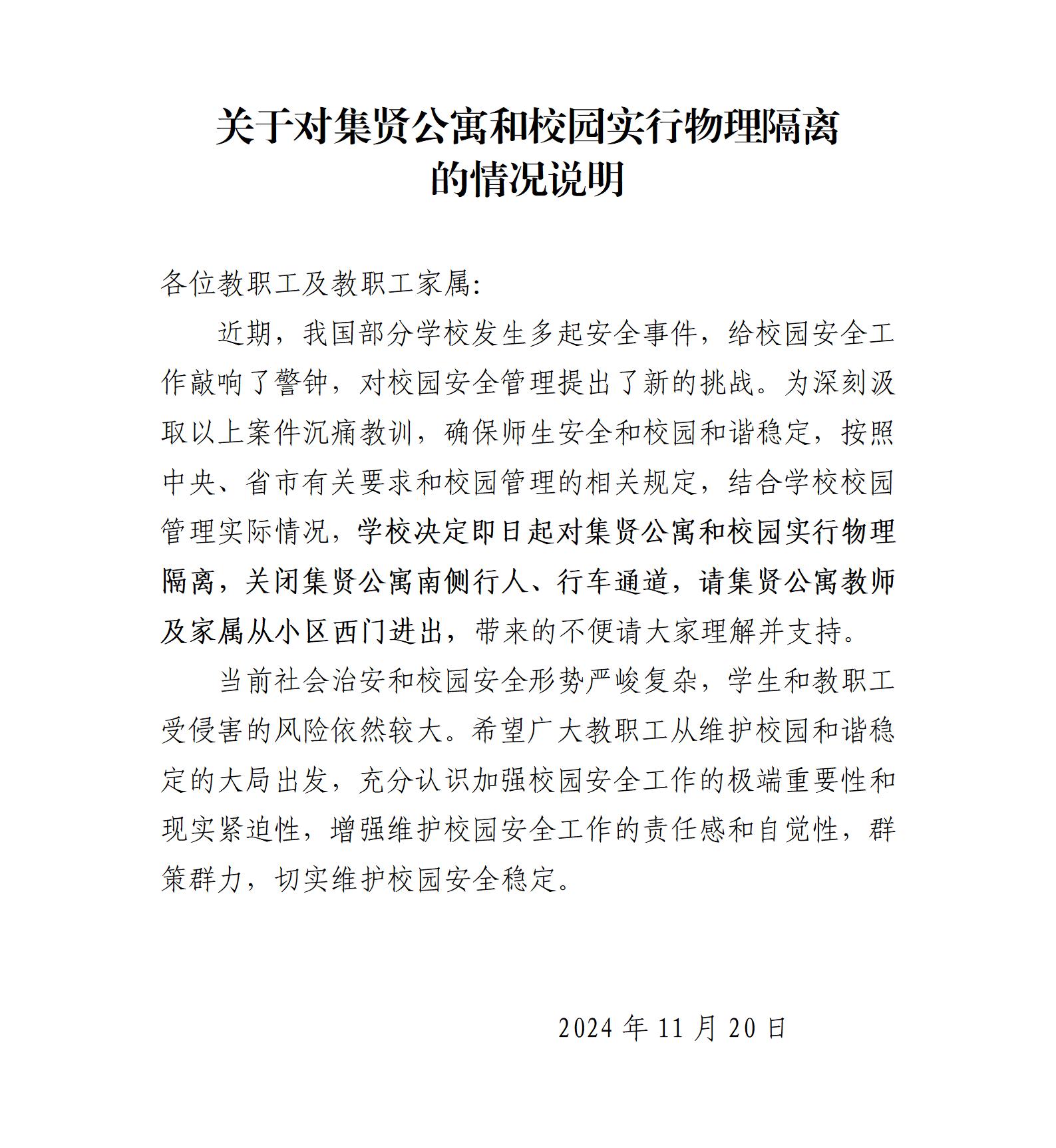 关于对集贤公寓和校园实行物理隔离的情况说明