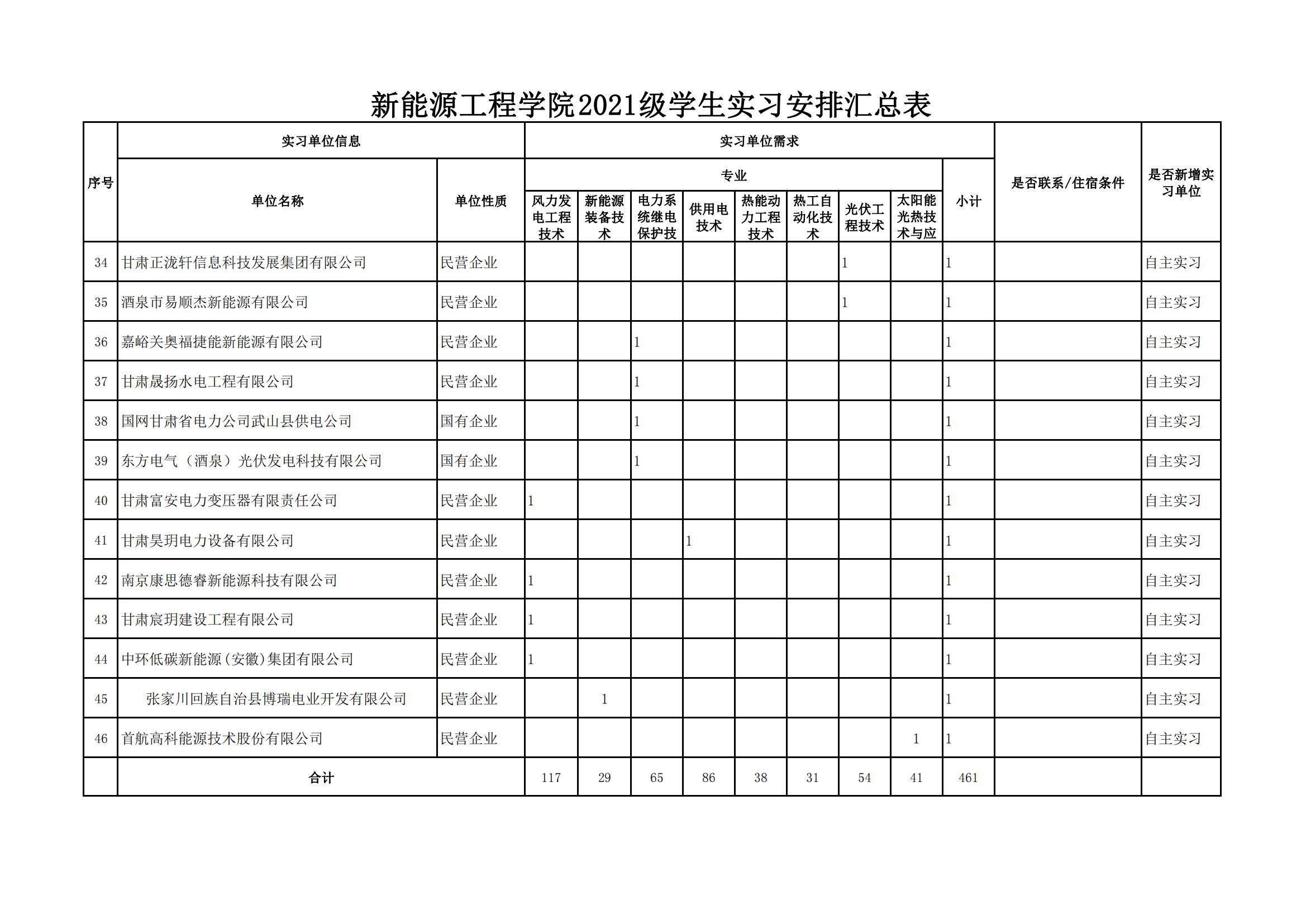 根据《教育部等八部门关于印发〈职业学校学生实习管理规定〉的通知》(教职成〔2021〕4号)和《甘肃省职业学校学生实习管理实施细则》(甘教职成〔2022〕2号)文件精神。经学校党委会议审议通过,新能源工程学院2021级学生集中实习安排32家实习单位,经学生自主申请办理14家实习单位,共计46家实习单位均符合《职业学校学生实习管理规定》相关要求。现予以公示,接受社会监督。