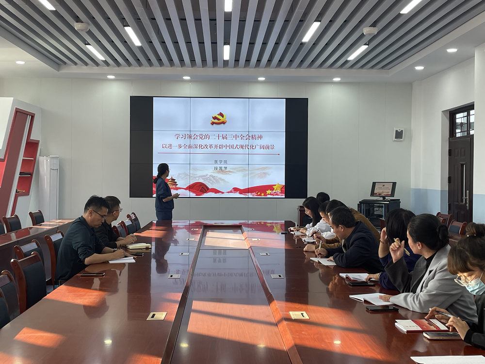 为深入学习贯彻党的二十届三中全会精神,进一步统一思想、凝聚共识,切实发挥党员教师先锋模范作用,引领全体师生朝着办人民满意的教育迈进。2024年10月9日下午,在弘远楼A501会议室,由医学院党支部副书记段国萍为全体党员讲授了“以进一步全面深化改革开辟中国式现代化广阔前景”专题党课。