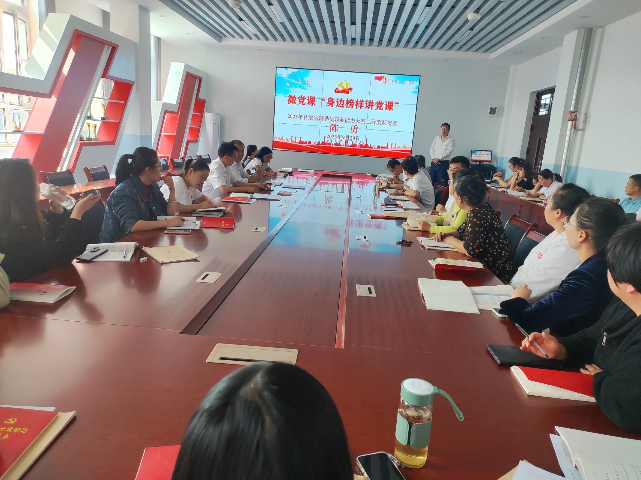 9月20日下午,医学院党支部开展“身边榜样讲党课”活动。此次活动邀请医学院“2023年甘肃省班主任业务能力比赛”二等奖获得者陈勇老师为大家讲党课,全体教职工参会。本次活动旨在搭建班主任互相学习的平台,加强班主任队伍建设,提高班主任的专业素养。