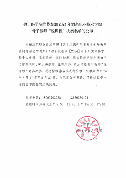 关于医学院推荐参加2024年酒泉职业技术学院骨干教师“说课程”决赛名单的公示