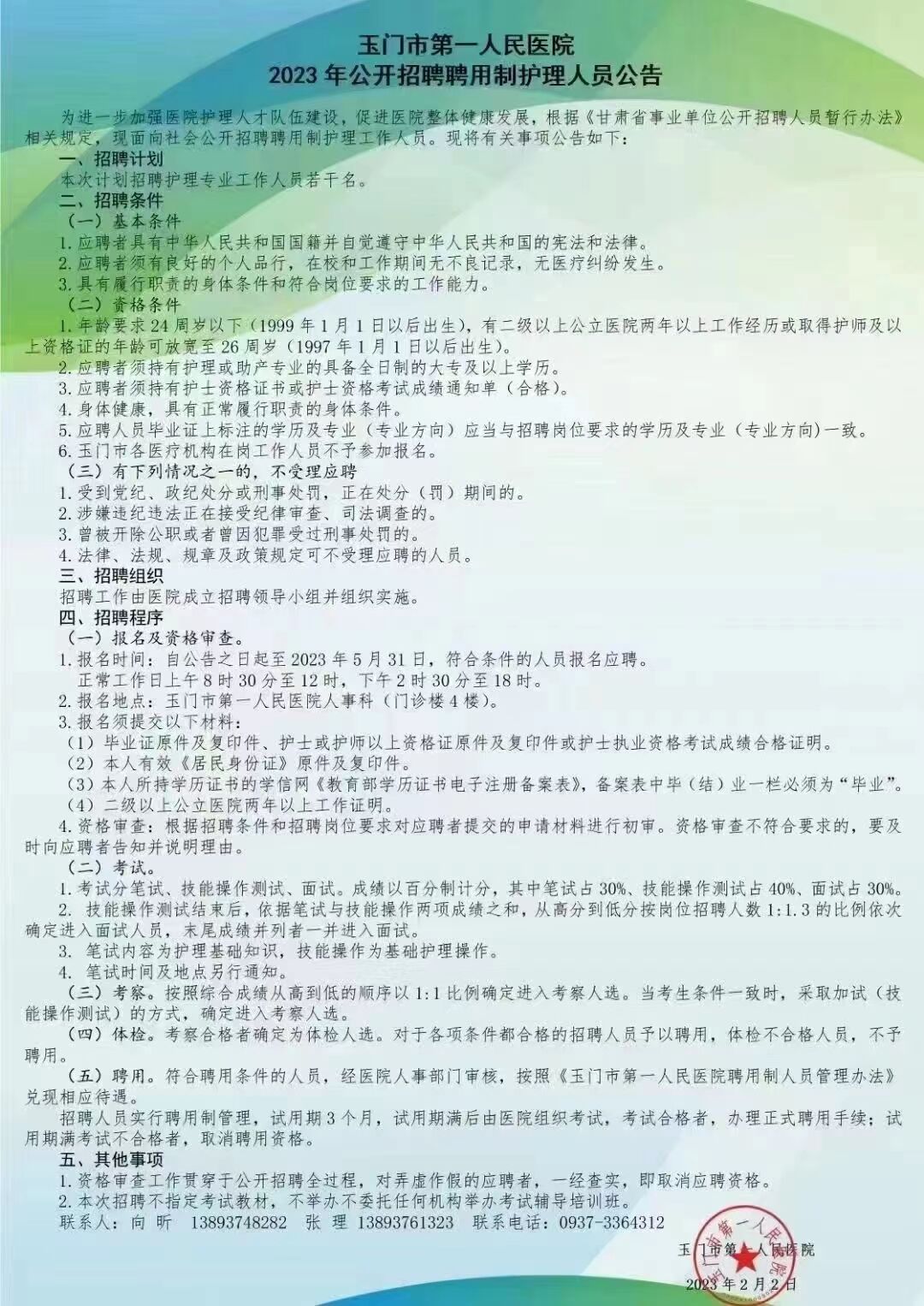 玉门市第一人民医院招聘信息