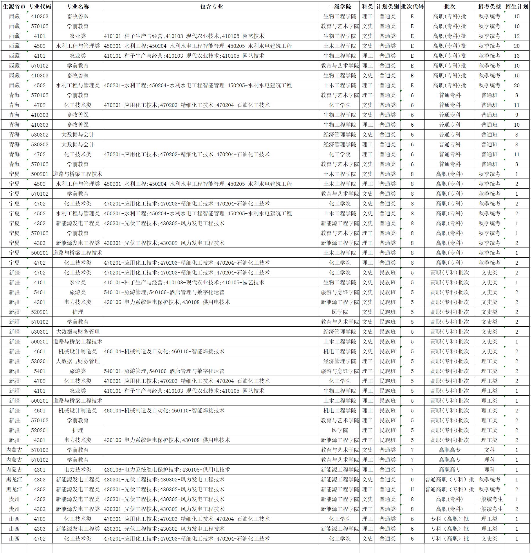 酒泉职业技术学院2023年省外普通高考招生计划