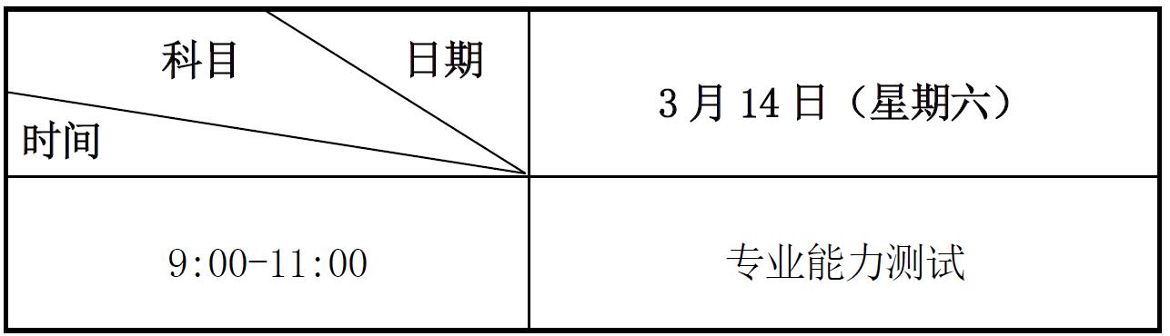 首轮免试招生专业能力测试时间为:3月14日,测试地点由招生学校自主确定并通知参加测试的考生。具体测试时间及测试科目安排如下(北京时间):
